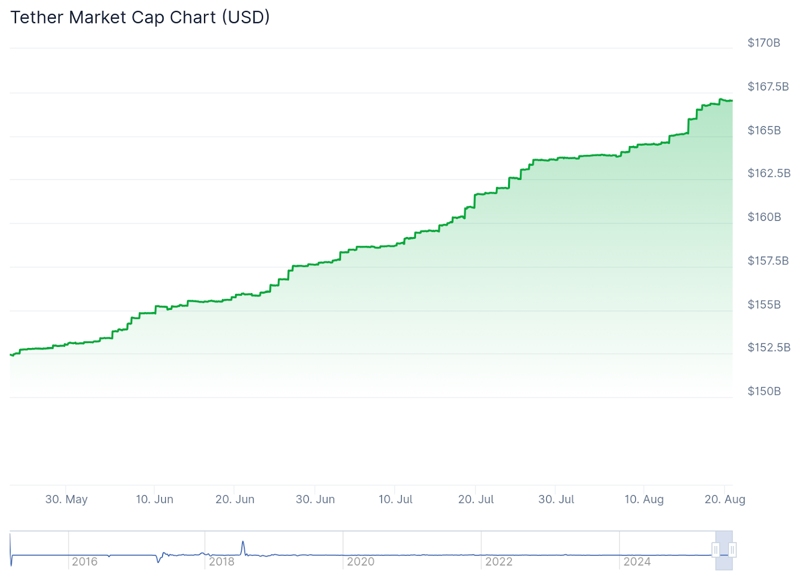 Tether 的USDT (迄今為止市值最大的穩定幣)的流通供應量已增加超過 70 億美元,保持了超過 60% 的市場主導地位,截至 8 月 21 日,其市值已超過 1670 億美元——自 GENIUS 成為法律以來增長了 4.3%。