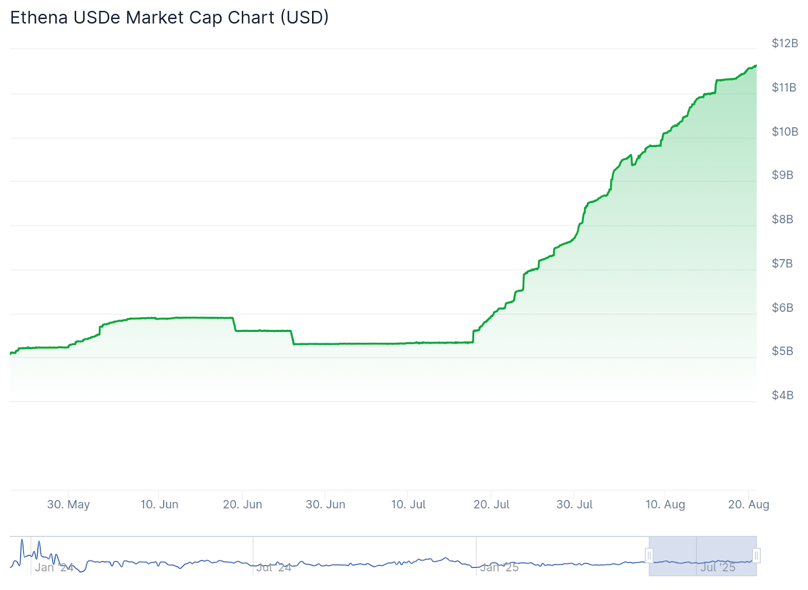 規模最大的收益型穩定幣Ethena ( USDE ) 的供應量增長更為顯著,同期增長了約 60 億美元,增幅達 107%,從 56 億美元增至 116 億美元。自 GENIUS 簽署以來的大幅增長表明,儘管美國立法禁止此類產品,但市場對內置收益的穩定代幣的需求仍在不斷增長。然而,USDE 的發行方 Ethena Labs 總部位於美國境外。