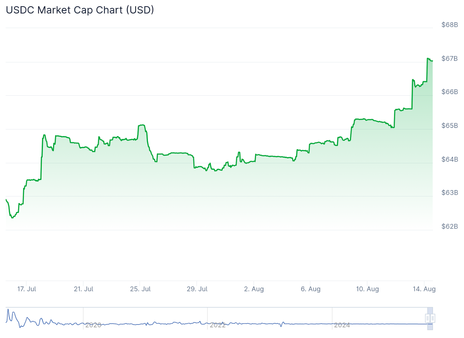 與此同時,美國最大、全球第二大穩定幣發行商Circle,其無收益型USDC的供應量自簽署以來增長了約4%。USDC的供應量起初增長較為溫和,從《GENIUS法案》頒佈前夕的648億美元增至8月中旬的655億美元,但這一數字在過去十天內最終躍升至675億美元。