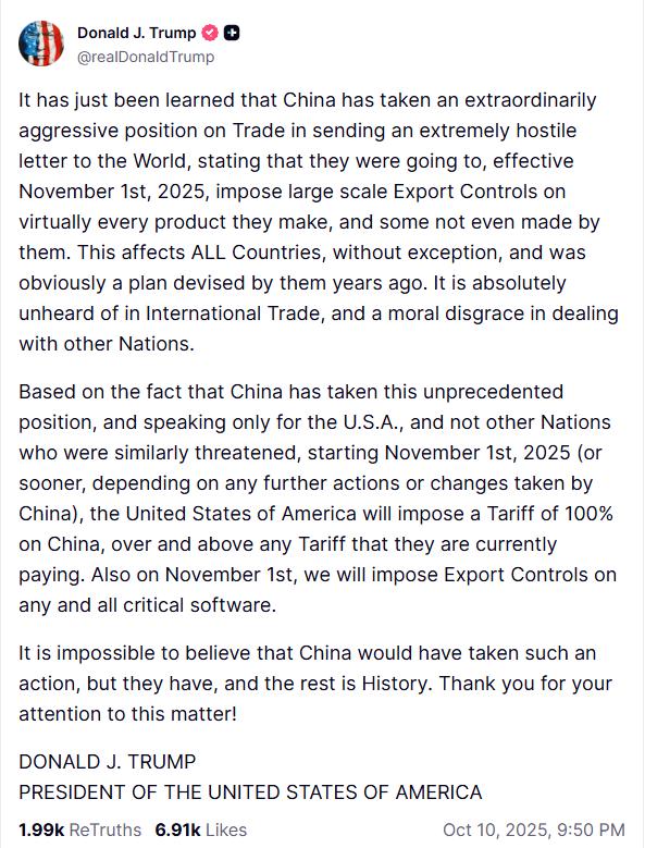 特朗普在網上發表聲明稱,美國將從 11 月 1 日起對所有中國進口產品徵收 100% 的關稅,並稱北京方面採取了“極其激進”的舉措,對“幾乎所有產品”實施廣泛的出口管制。
