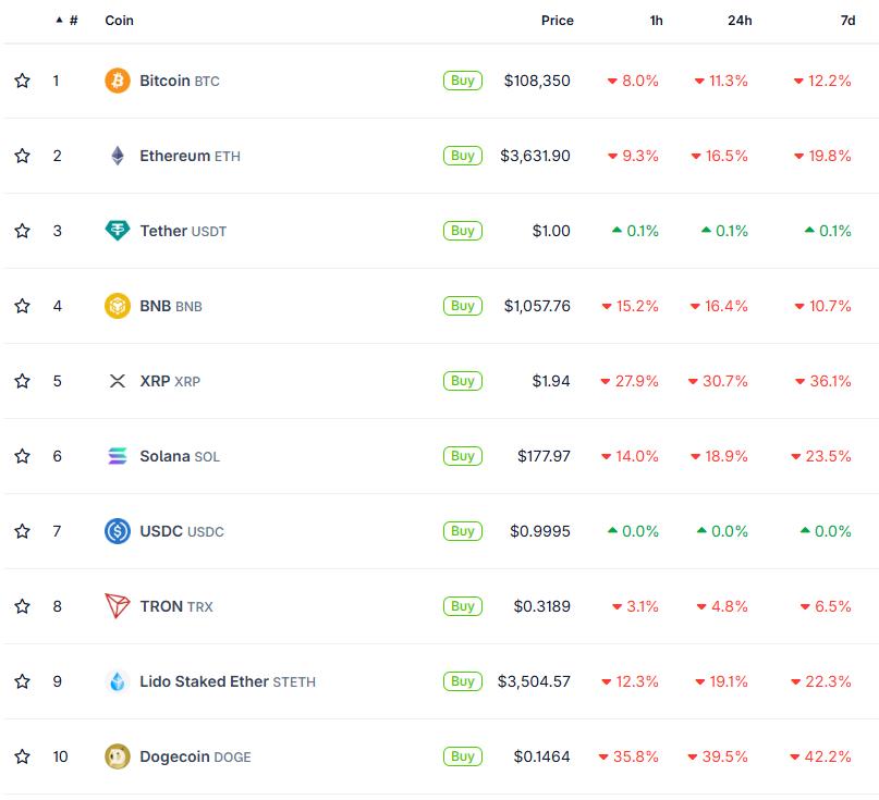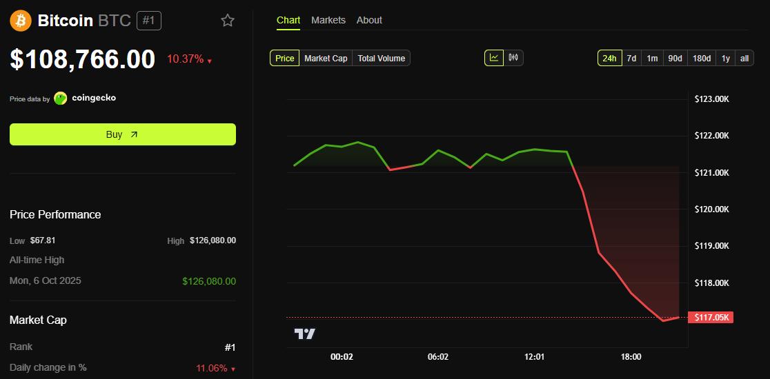 比特幣從 122,000 美元暴跌 10% 至 107,000 美元。以太坊、 XRP和BNB下跌超過 15%。