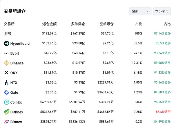 然而,這數據或許只是冰山一角,據相關從業者透露,真實爆倉數據遠超公開,“Binance 爆倉數據應該遠超 Hyperliquid 和 Bybit”,根據 Coinglass 數據披露,目前 Binnace 爆倉數據僅為 Hyperliquid 的 5 分之一。