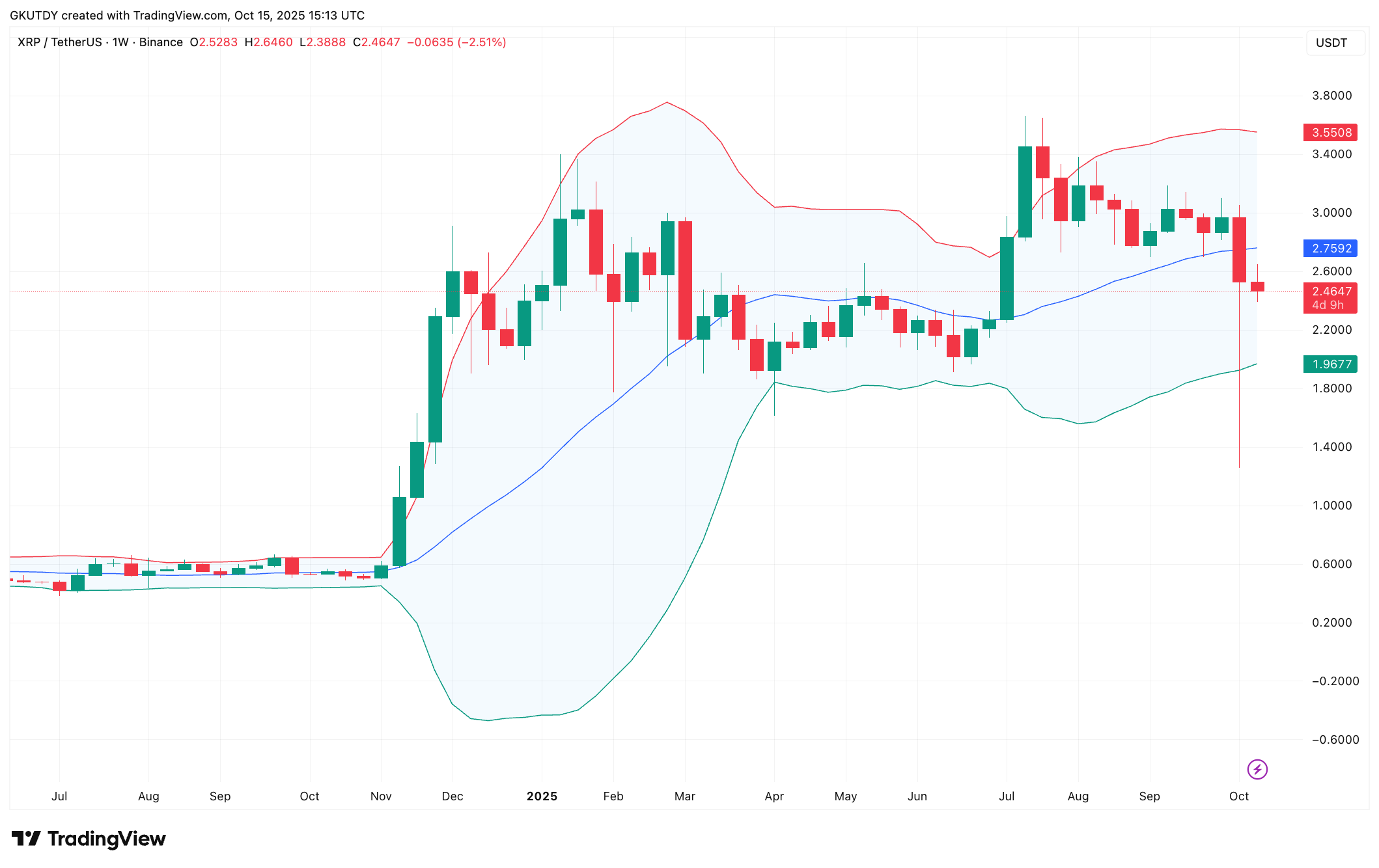 XRP已回升至 2.49 美元,這一水平可能表明在上週早些時候大幅下跌 55% 之後趨於穩定,但布林帶的情況並不樂觀。