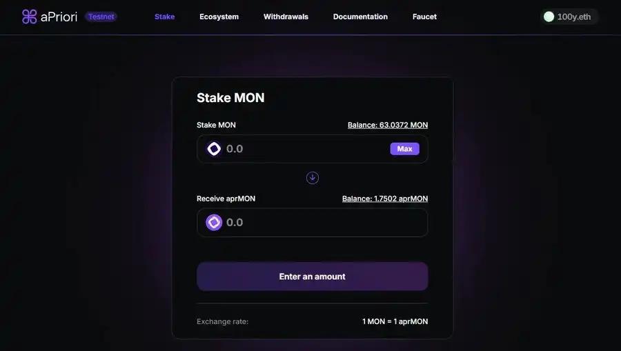 aPriori 於 2023 年從 Hashed 和 Arrington Capital 獲得了 200 萬美元的種子輪融資,2024 年 7 月從 Pantera、Consensys 和 Flow Traders 獲得了 800 萬美元的種子輪融資,並於 2025 年 8 月從 Pantera、HashKey 和 IMC Trading 獲得了額外的 2000 萬美元融資。這使得它成為 Monad 生態系統中資金最充足的 dApp 之一。用戶可以在測試網上質押 MON 來獲取 aprMON,並在各種 DeFi 協議中使用它。