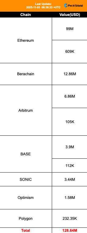 截止下午 5 時 41 分,來自慢霧的調查顯示,其總被盜金額為 1.2864 億美元,其中增加了 Berachain 的 1286 億美元。
