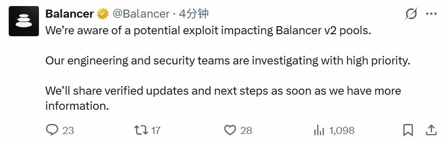 目前,Balancer 團隊發佈聲明稱 V2 池可能存在漏洞,工程師與安全團隊正調查該事件。