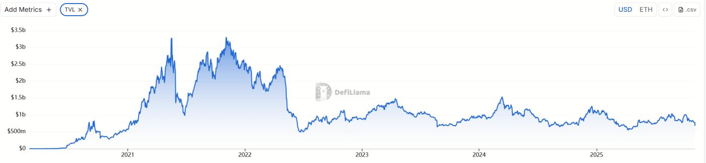 Balancer 成立於 2020 年,由 Balancer Labs 開發,是一個自動化做市商 (AMM) 協議,允許用戶創建自定義流動性池,支持多種資產的權重調整。與 Uniswap 等簡單 AMM 不同,Balancer 的設計更注重靈活性和資本效率,尤其在 V2 版本中引入了 “提升池” (Boosted Pools) 和金庫 (Vault) 系統,這些功能旨在優化收益率並減少滑點。上輪 DeFi 熱潮,Balancer 的 TVL 一度升至 32.39 億美元。