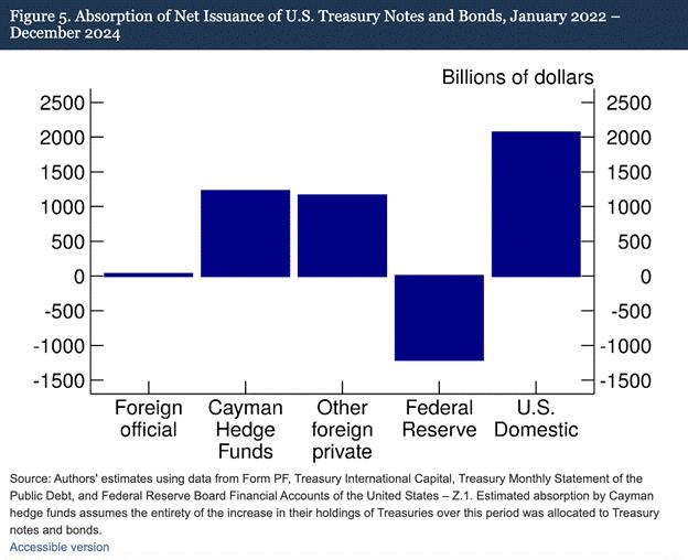 我們的研究結果表明,開曼群島對沖基金正日益成為美國國債的邊緣外國買家。如圖5所示,在2022年1月至2024年12月期間,正值聯準會透過允許到期國債退出其投資組合來縮減資產負債表規模之際,開曼群島對沖基金淨購入了1.2兆美元的國債。假設這些購買全部為國債,那麼它們吸收了國債淨發行量的37%,幾乎與所有其他外國投資者的總和相當。