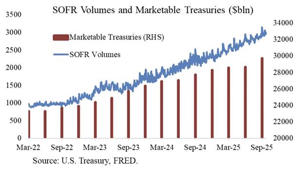 貨幣市場基金(MMF)的目標是盡可能降低信用風險並賺取短期利率。這意味著貨幣市場基金的主要收益來源包括將資金存放在儲備金(RRP)中、在回購市場放款以及購買國庫券(T-bills)。 [2]在這三種情況下,它們都承擔了聯準會或美國財政部的信用風險,而這實際上是無風險的,因為政府總是能印鈔來償還債務。在儲備金被清空之前,存放在那裡的數十億甚至數萬億美元資金將為回購市場提供現金。這是因為儲備金低於標準作業利率(SOFR),因此追求利潤最大化的貨幣市場基金會將資金從儲備金中取出並放款到回購市場。但現在由於國庫券利率極具吸引力,儲備金餘額為零;貨幣市場基金透過向美國政府放款來實現利潤最大化。