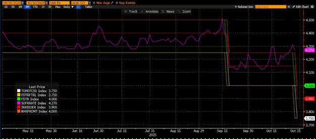 讓我們回顧一下聯準會如何操縱短期利率。聯準會有兩個政策利率:聯邦基金利率上限和下限;目前分別為4.00%和3.75%。為了迫使有效短期利率(即擔保隔夜融資利率,SOFR)落入該區間內,Fed使用了一些簡單粗暴的政策工具。我將按利率從低到高的順序簡要介紹這些工具。