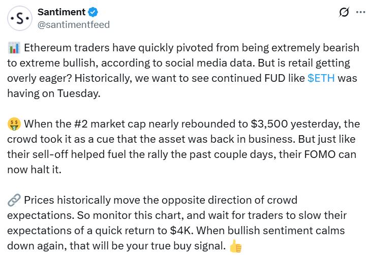 Santiment 表示:“以太坊交易員的情緒從極度悲觀迅速轉變為極度樂觀。”他還補充說,當姨太 “昨天幾乎回升到 3500鎂時,市場將其視為該資產重回正軌的信號。”