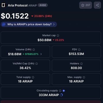 發現今天 @buidlpad 上打新的 $AriaIP 可以交易了,貌似也沒啥人提,就是那個 @StoryProtocol 鏈的生態龍一項目 @Aria_Protocol ,目前收益翻倍多一點。 看了一下籌碼結構,目前初始流通官宣是33% 但是項目方自己直接持有26% 幣安Alpha 1% Buidlpad 1% 社區5% (Aria Points 1%, $IP Holder空投1%,