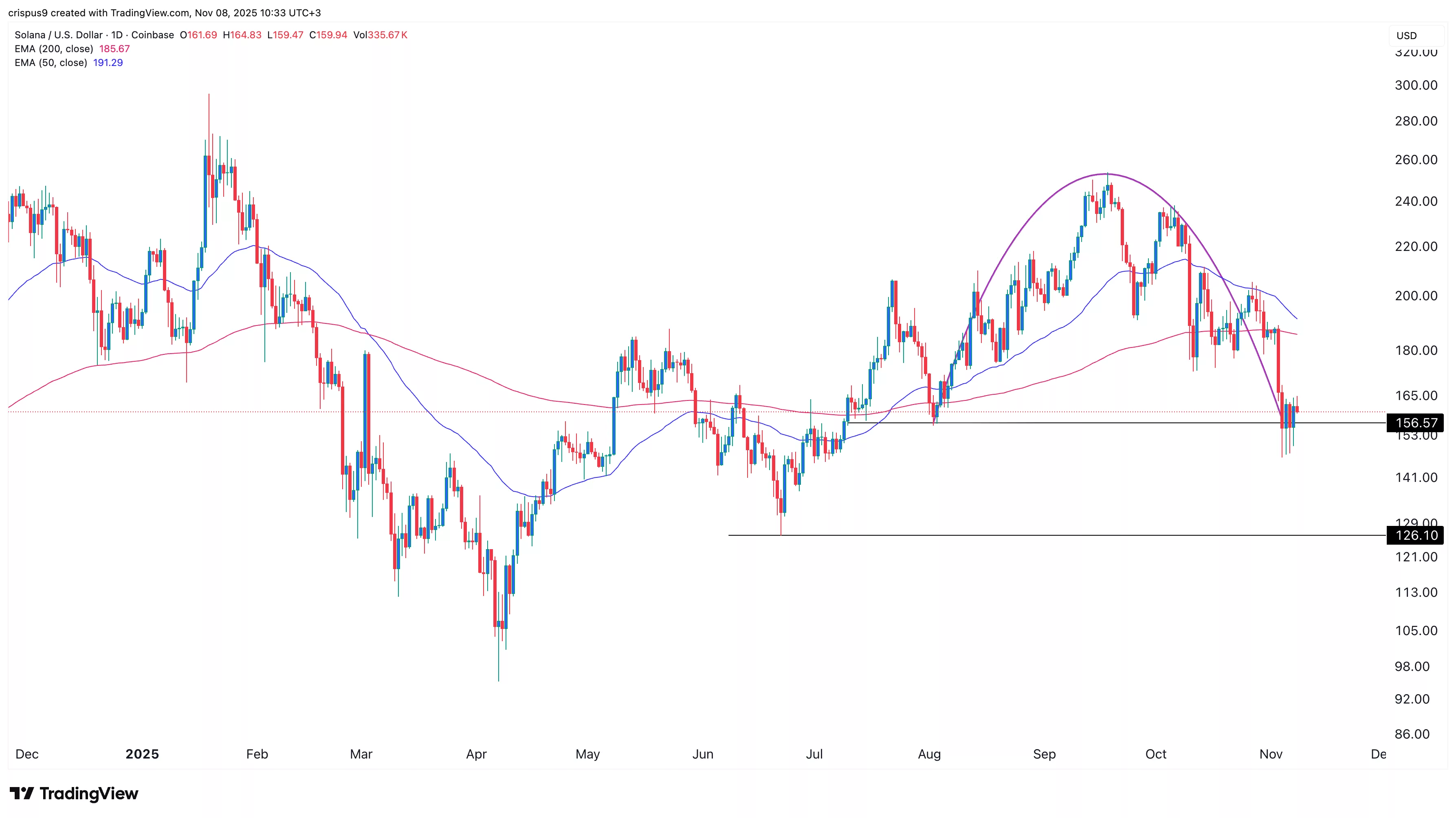 - Solana 的價格已從 9 月的高點下跌超過 35%。