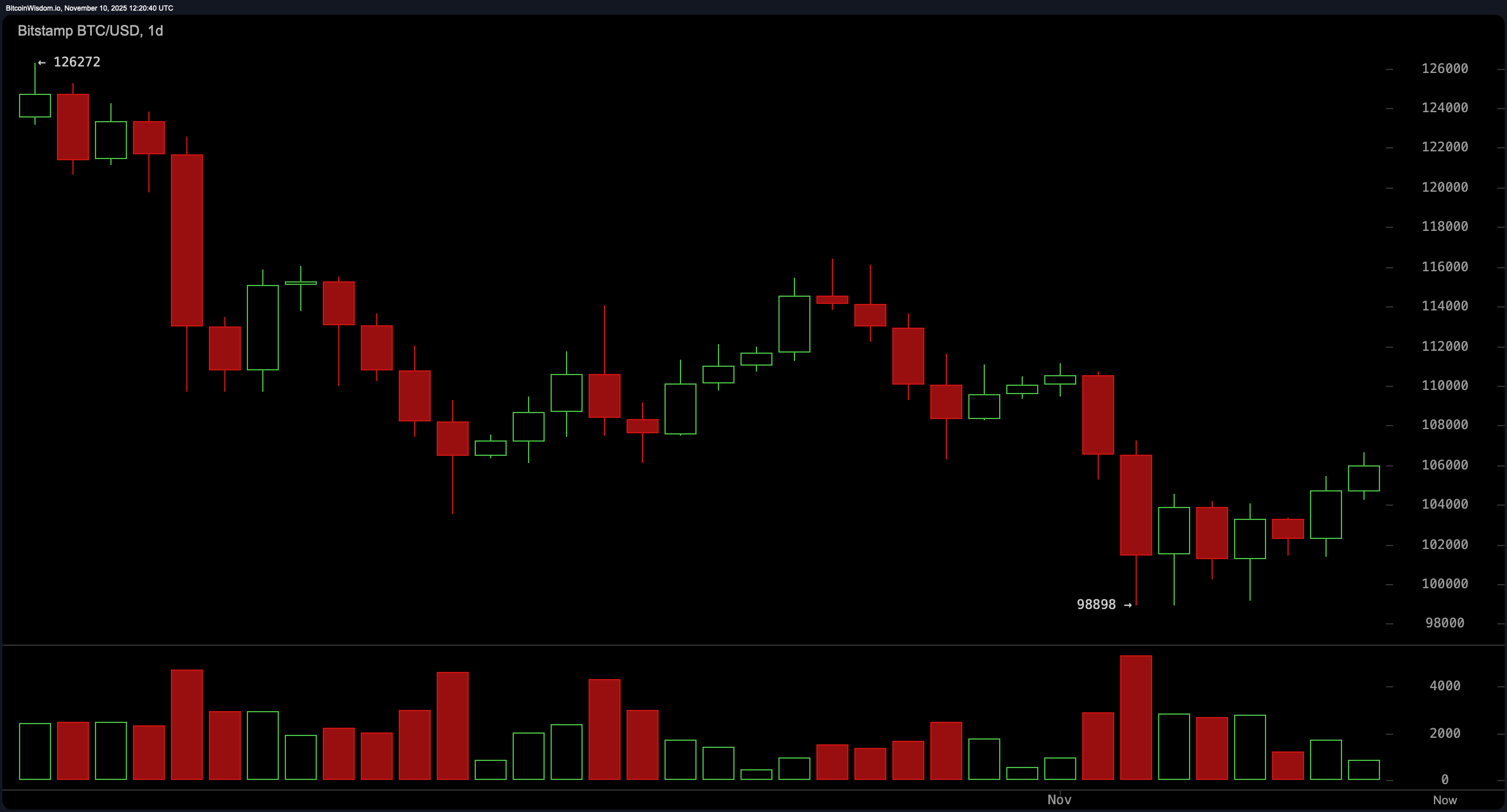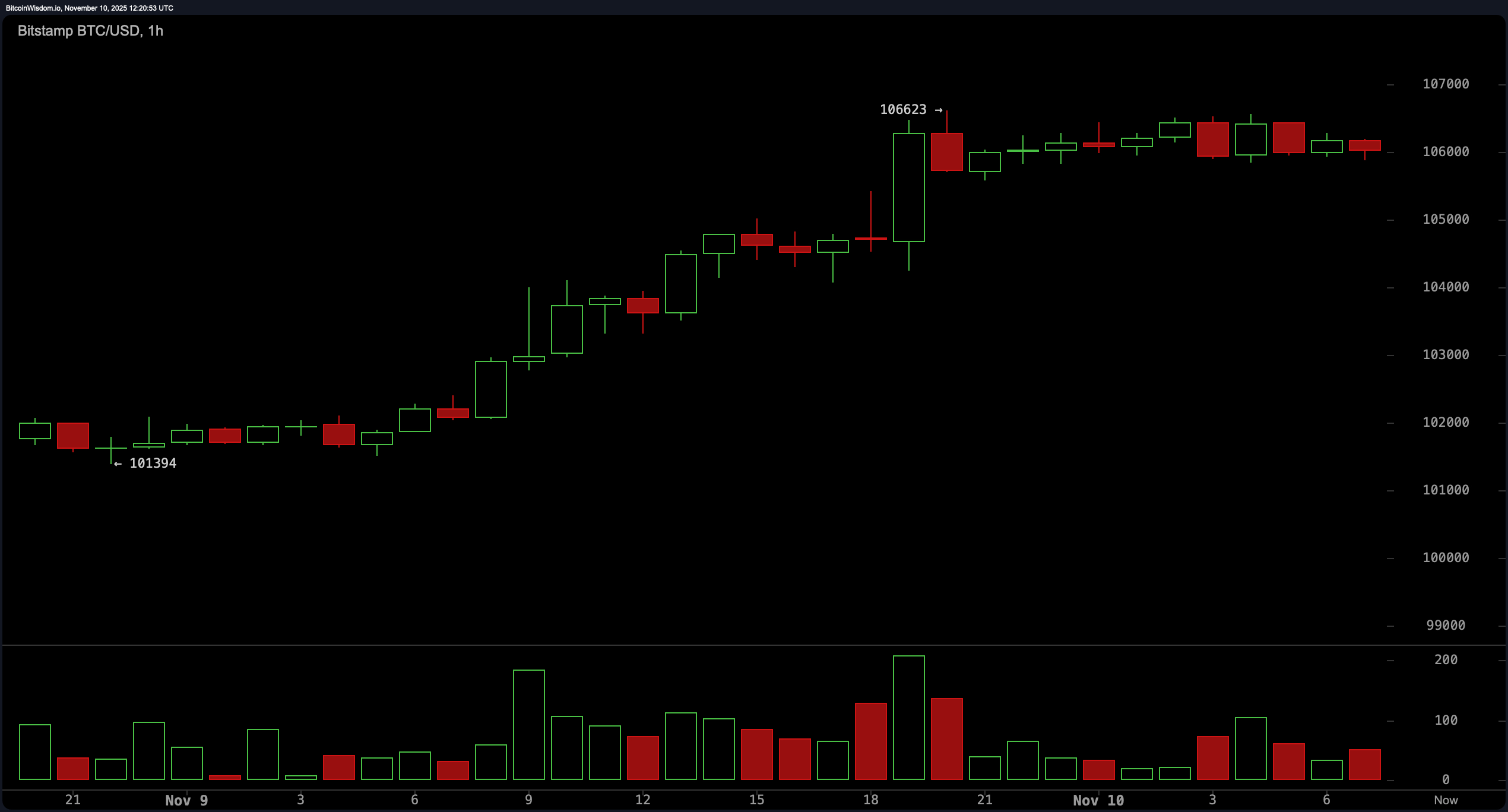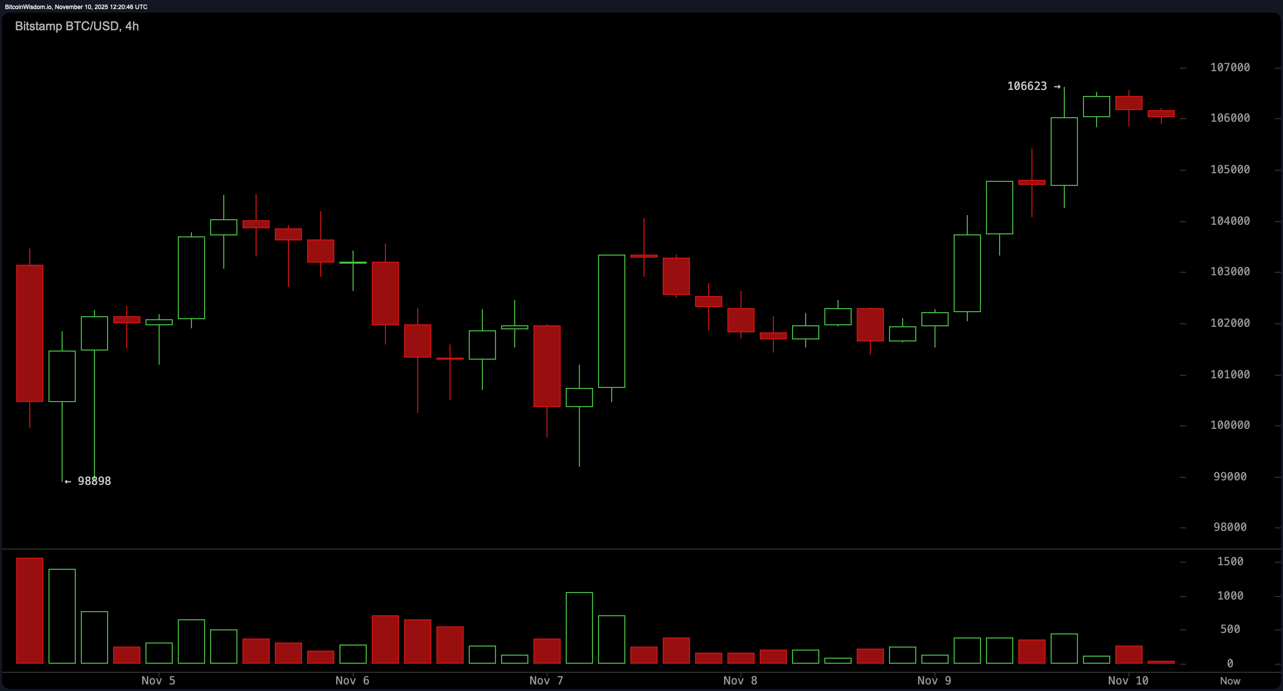 從4小時圖來看,目前的動能似乎預示著一場高風險的博弈即將展開。一個上升楔形正在形成——這通常是下跌的前兆,儘管在加密貨幣這個變幻莫測的市場中,一切皆有可能。不過,自11月7日以來不斷出現的更高低點表明,比特幣仍然保持著一定的上漲勢頭。上漲過程中成交量的增加更增添了一層神秘感,尤其是在價格測試106,600美元至107,000美元的阻力位時。如果價格突破該阻力位並得到成交量的確認,比特幣可能會大幅上漲;但如果跌破102,000美元,則可能回落至100,000美元的心理關口。