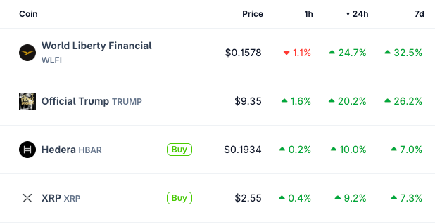 比特幣今天上漲了略高於 1%,但 World Liberty Financial (WLFI) 和 TRUMP memecoin 是今天表現最好的兩種加密貨幣,在過去 24 小時內分別上漲了 24% 和 20%。