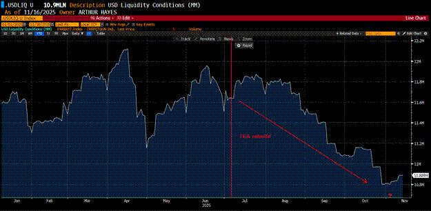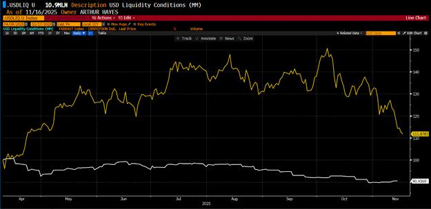 然而,近期比特幣的美元隱含流動性預期會惡化。比特幣價格自10月初創下的歷史高點以來已下跌25%,許多山寨幣的跌幅甚至超過了紐約市長選舉中的資本家。究竟是什麼改變了這一切?川普政府的言論並未改變。川普仍然抨擊聯準會維持過高的利率。他和他的幕僚們繼續談論透過各種手段刺激房地產市場。而最重要的是,川普在每一個關鍵時刻都向中國妥協,他遲遲不願扭轉中美兩大經濟體之間的貿易和金融失衡局面,因為對於那些必須每兩到四年面對選民的政客來說,由此帶來的經濟和政治痛苦實在難以承受。同樣沒有改變的是,美元流動性的萎縮,而市場現在對此的重視程度甚至超過了政客的言論。