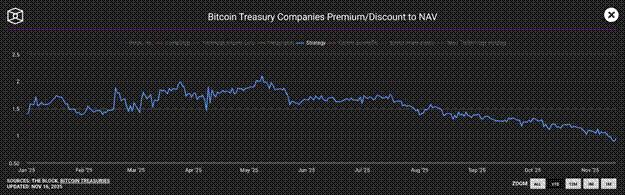 數位資產庫(DAT)公司為機構投資者提供了另一種獲取比特幣敞口的方式。 Strategy(股票代號:MSTR US)是持有比特幣數量最多的DAT。當其股票交易價格遠高於其比特幣持有量(稱為mNAV)時,該公司可以透過發行股票和其他融資方式以較低的成本獲取比特幣。隨著溢價轉為折價,Strategy取得比特幣的速度也隨之降低。