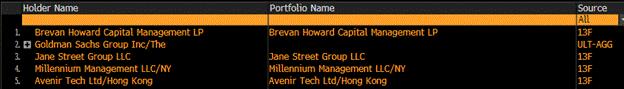 以下是IBIT US的五大持有者。它們都是大型對沖基金或專注於自營交易的投資銀行,例如高盛。