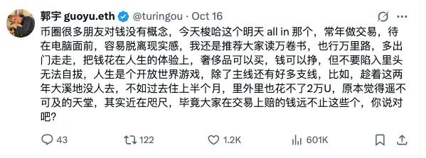 他寫道:“幣圈很多朋友對錢沒有概念,今天梭哈這個,明天 All in 那個。常年做交易、盯盤、待在電腦面前,容易脫離現實感。我還是推薦大家讀萬卷書,也行萬里路。把錢花在人生的體驗上,奢侈品可以買,錢可以掙,但不要陷入裡頭無法自拔。“