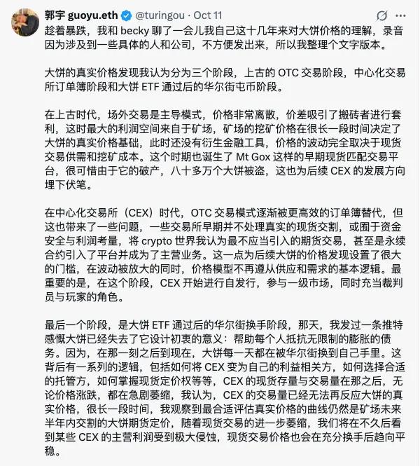 10月11日一場加密市場的大跌讓郭宇再次在推特上系統闡述了他對這個行業長達十餘年的觀察。他系統闡述了他對比特幣價格發現機制的理解,並將這個過程分為三個階段。