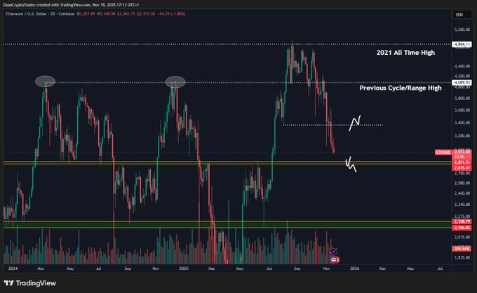 自10月初以來,ETH)一直在下降通道內交易,經歷了兩次連續的下跌,每次下跌幅度約為27.5%。這種持續的趨勢使以太坊的價格低於關鍵技術水平,反映出投資者普遍的謹慎情緒。