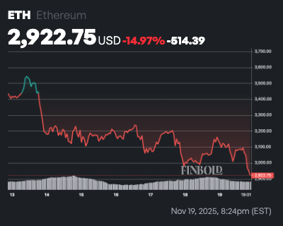 截至發稿時,以太坊交易價格為 2,921 美元,在過去 24 小時內下跌超過 7%,在過去一週內下跌近 15%。