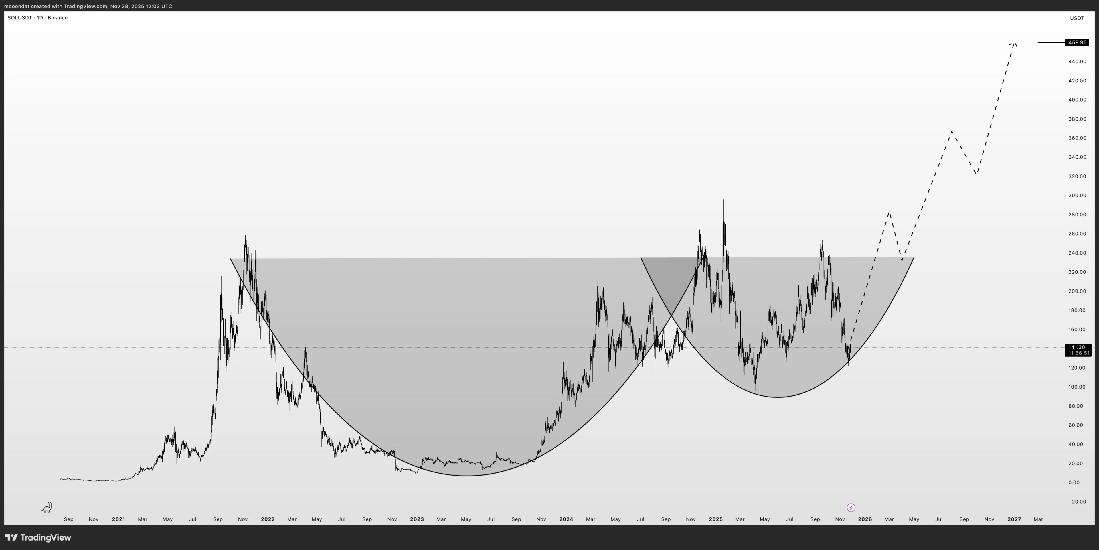 另一位分析師moonbag則關注著更高時間框架上正在形成的更大的多年杯柄形態。價格從120美元至135美元的積累區域持續上漲。若能重新站上160美元,則有望進一步增強向200美元邁進的勢頭。