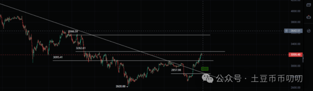 3100附近(前期結構支撐),2900–3000區間(黃金分割0.382–0.5回撤與缺口共振區)。如果價格先向上突破平行頂部並出現假突破,可考慮短線做空,待回調至上述區間後再接多單。