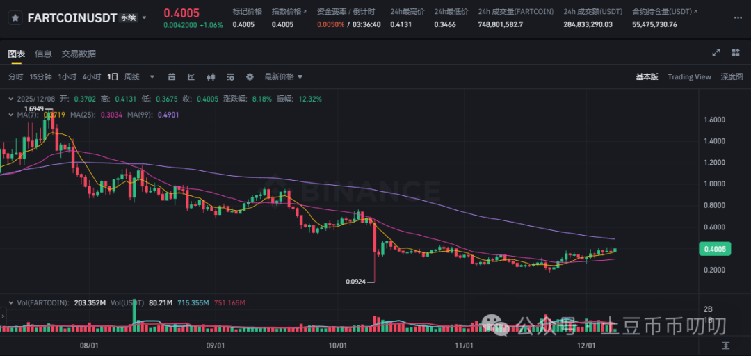 可以關注fartcoin,在價格回落至 0.38-0.36 區間時考慮做多,止損設在 0.342;或者等待突破 0.42 後右側確認進場,上方目標看到 0.55。
