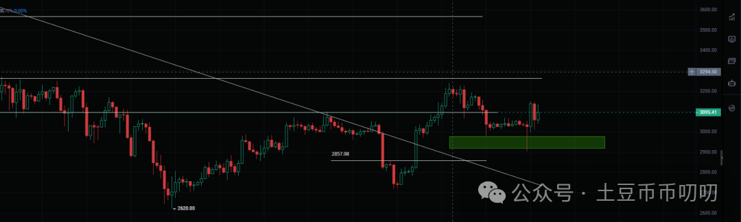 以太坊日線結構明確,3075為關鍵支撐(止損互換位),此前跌破呈假信號,後隨BTC同步回補FVG,當前站穩EMA過濾線持續強勢,大目標指向3300-3400缺口與30日均線共振區。(若BTC突破,ETH反彈或更強)。
