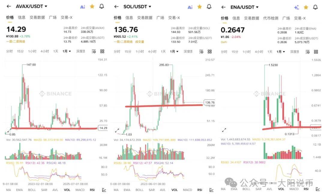 觀察SOL、AVAX、ENA的月線走勢可以發現,它們已觸及關鍵的月線支撐位,這分別代表了主流幣、老牌公鏈幣及本輪牛市新幣的動向,也大致反映出當前山寨幣市場的整體狀況。