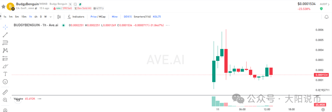 虎皮企鵝BudgyBenguin 昨晚熱度登頂,獲BNBCHAIN官方互動。首波ATH僅50萬,築底於十餘萬。第一波主因是KOL喊單過密,且歷史經驗表明BSC熱點往往先深度洗盤(此輪小時級別已跌80%,從50萬到10萬),不讓散戶輕易拿籌。目前洗盤或已結束,走勢基本分曉了。