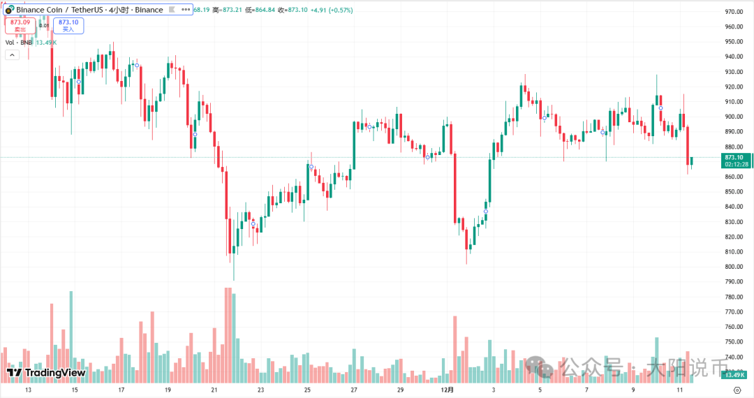 BNB目前為盤面最弱。下午關注873位置,若小時線收於該位上方,則壓力依次看882、898、915;若無法站穩873,支撐關注861、846、830。