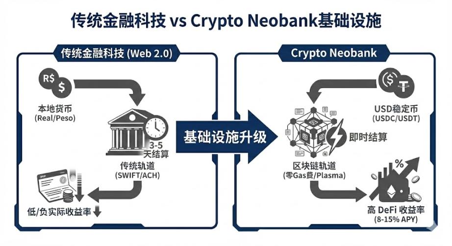 拉美市場正在經歷從傳統金融科技向 Crypto Neobank 進化的關鍵轉折點。這不僅是技術的升級,更是商業模式的代際跨越。