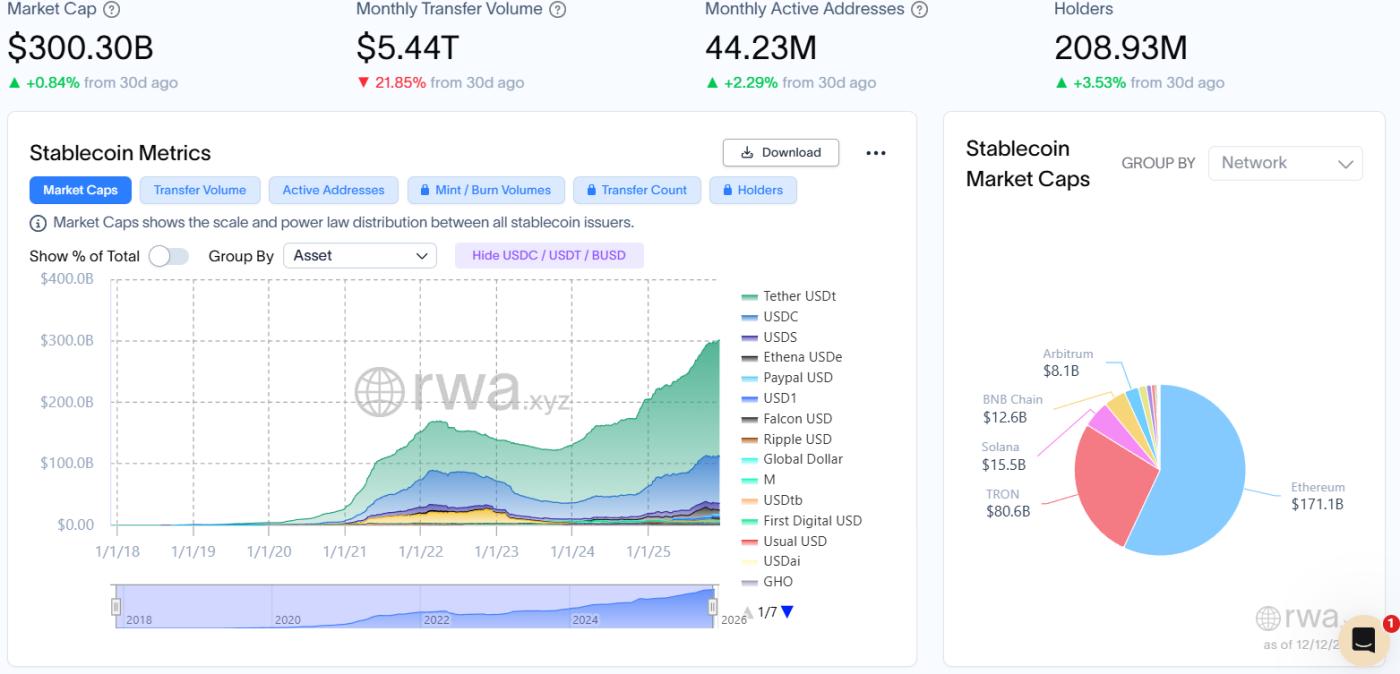 穩定幣總市值達3,003.00億美元,環比上月同期微漲0.84%,增速仍處低位,整體規模進入低速擴容階段;然而,關鍵流動性指標顯著惡化:月度轉賬量驟降至5.44萬億美元,環比上月同期大幅下滑21.85%;同時,月活地址總數回落至4,423萬,環比上月同期微跌2.29%;持有者總數穩步增長至約2.09億,環比上月同期微增3.53%,形成強烈背離,反映市場正面臨 “流動性收縮與用戶活性衰退” 的雙重壓力。市值雖勉強維繫,但實際資金週轉效率與鏈上交易活躍度正快速下降,反映出支付結算需求減弱或資金流出鏈上體系。數據表明,市場可能已從“存量優化”階段轉入 “流動性衰減” 通道。頭部穩定幣為USDT、USDC及USDS,其中USDT市值環比上月同期微漲1.99%;USDC市值環比上月同期微增0.58%;USDS市值環比上月同期上漲3.52%。