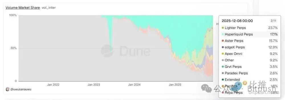 然而,USDH 也標誌著 HYPE 代幣在 9 月中旬達到了巔峰——也是競爭開始顯現的時刻。Aster(CZ 支持的基於幣安的交易所)和 Lighter(一個以太坊 L2 永續合約平臺)都通過激進的空投活動推出。交易量繼續分散,Hyperliquid 的市場份額分裂,在撰寫本文時僅佔 17.1%。