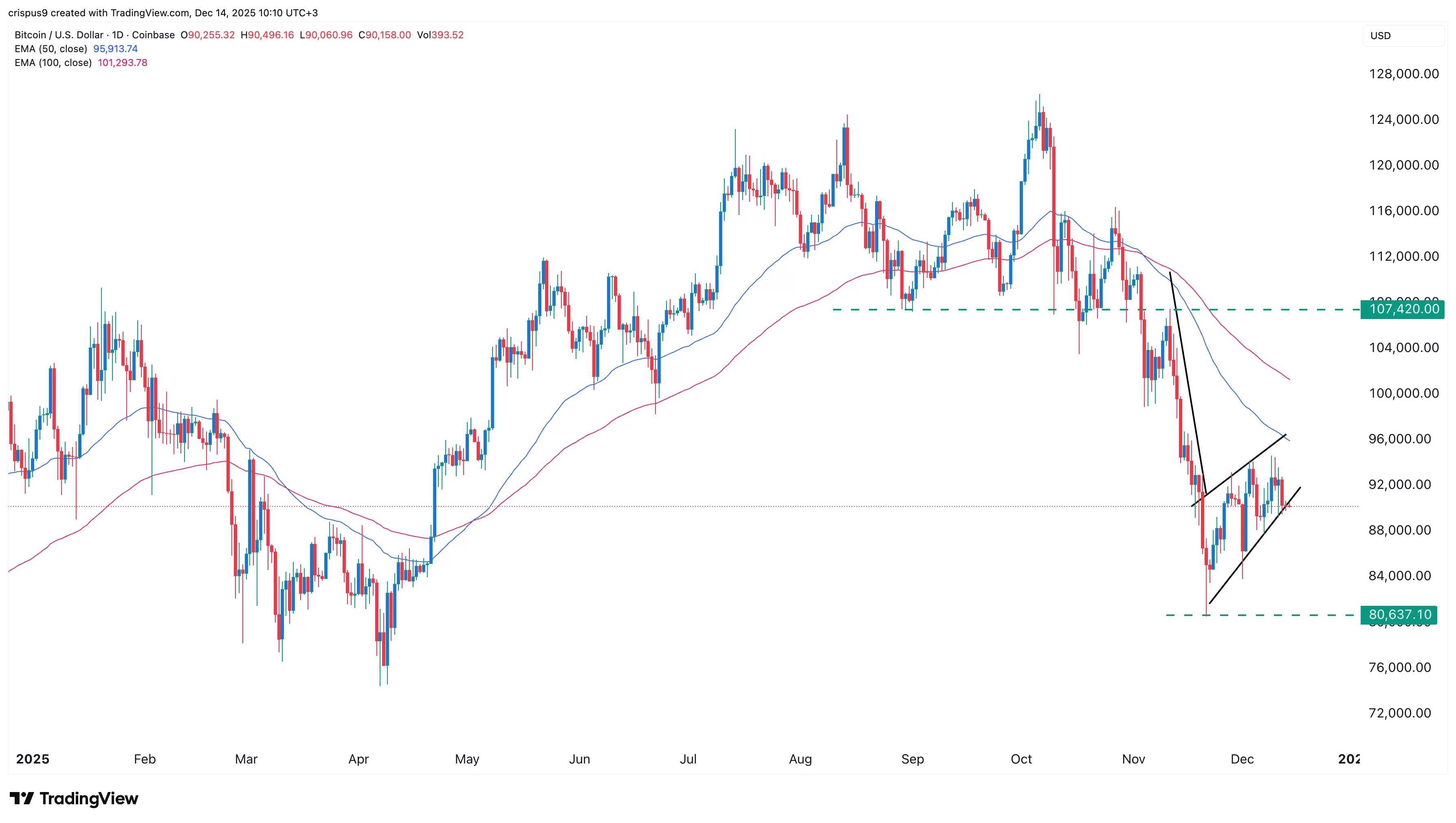 比特幣(BTC),作為加密貨幣的鼻祖,價格停滯在9萬美元的心理關口。這一價格比今年的最高點低了約29%,表明它仍然處於深度熊市之中。
