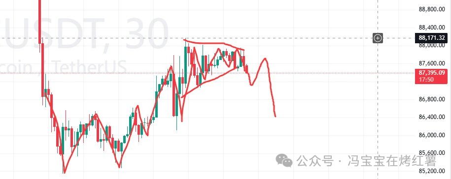 比特幣空單已成功接到,差不多在8.8萬附近的成本。目前價格處於小級別三角形整理形態,但已跌破下軌,所以短期大概率會有一波回調。小支撐位在8.6萬,如果跌破這個位置,空單可以繼續持有。
