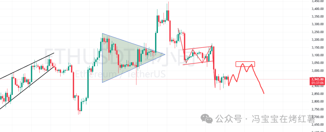 以太坊這波反彈很弱,前幾天的反彈都強於比特幣,但昨晚反彈太疲軟,連3000都沒摸到就回落了。我們的空單還沒接到,這裡預計會震盪一段時間。只要小級別不跌破短期低點,仍有機會反彈到3050附近,所以昨天計劃的空單可以繼續掛單等待。
