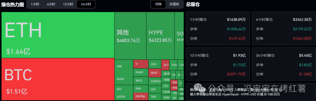 過去24小時全網共有156,621人被被爆倉,爆倉總金額為$5.40億美元,多單爆倉3.82億美元,空單爆倉1.58億美元。