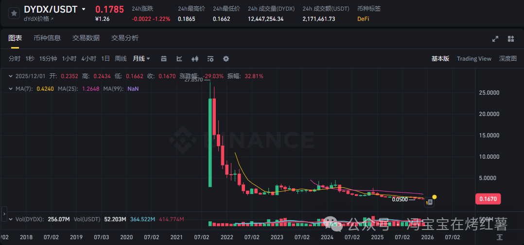DYDX是老韭菜的血淚教訓!2021年作為perpdex龍頭橫空出世,熱度堪比現在的HYPE,散戶重倉盼它成去中心化BNB,結果上線後一路暴跌99%,無數人血本無歸。山寨幣迭代極快,今日王者可能明日歸零,輸不起的散戶熊市囤市值前十幣種,風險會小太多!