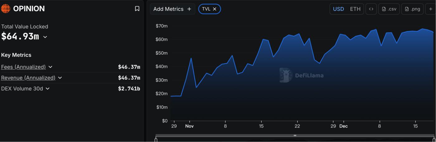 Opinion 於 10 月 23 日正式上線,一經推出便展現出了驚人的增長勢頭,一度成為增長最快的預測市場。其在公開上線一個月內交易量便突破了 50 億美元大關,上線 50 天內累計名義交易量突破 64 億美元,單日交易量則多次逾 2 億美元。其優勢在於將通脹、利率、就業等宏觀經濟指標標準化為可交易資產,使其成為宏觀導向型預測市場的代表案例。