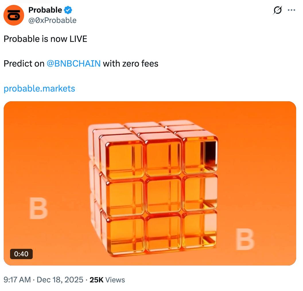 今日,BNB Chain 上預測市場 Probable 正式上線,該平臺由 PancakeSwap 和 YZi Labs 共同孵化,支持用戶預測加密貨幣、全球事件、體育賽事等事件,且無需任何手續費。與此同時,Coinbase 也在積極佈局,其在 System Update 發佈會上表示將大幅擴展其平臺交易資產範圍,主要包括股票交易、預測市場等多項新服務,以鞏固其「全能交易所」的市場定位。