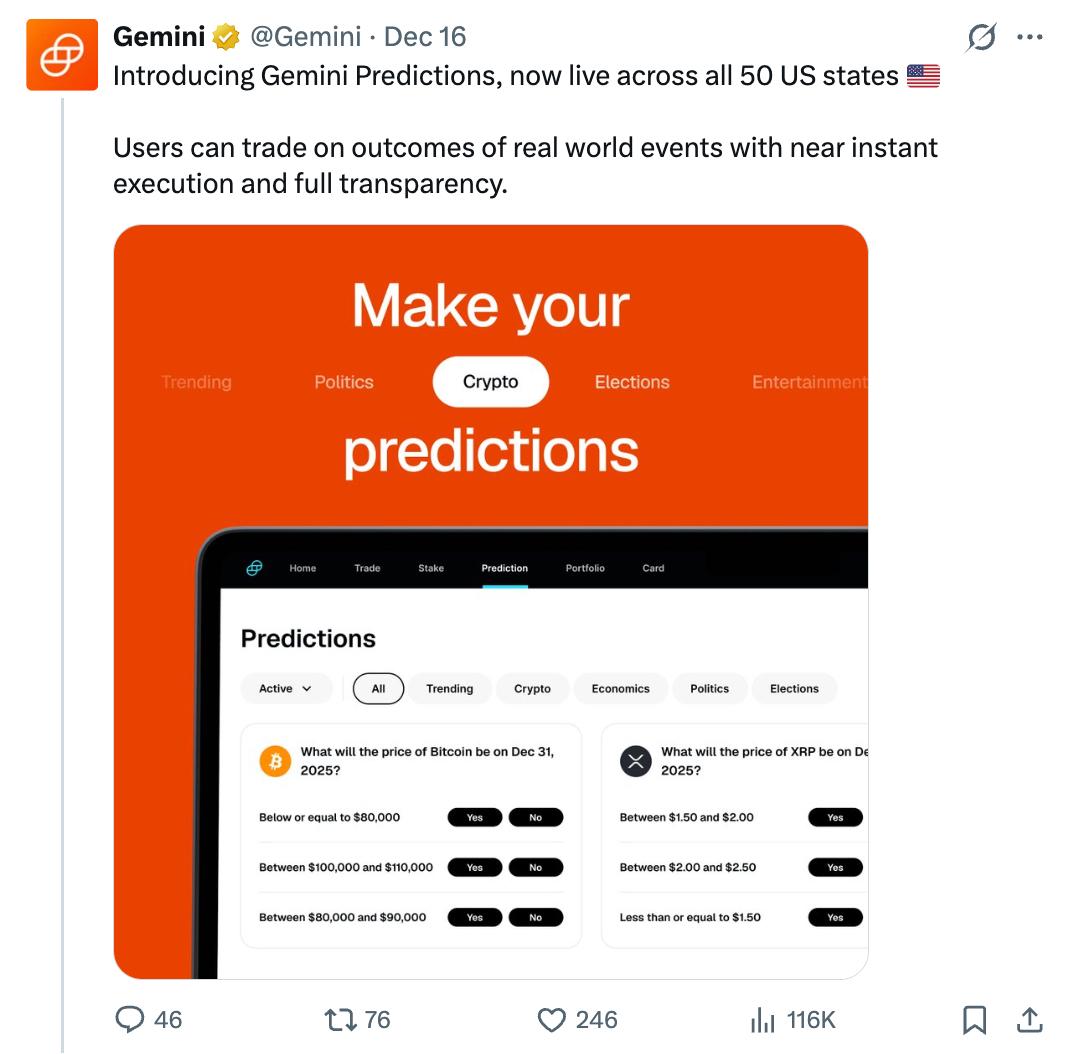 加密交易所 Gemini(股票代碼 GEMI)本月已獲美國商品期貨交易委員會(CFTC)批准進入預測市場領域。隨後,它迅速推出了預測市場產品 Gemini Predictions,並已在美國 50 個州全面上線。該產品支持用戶基於現實事件結果進行交易,提供近乎即時成交與完全透明度。