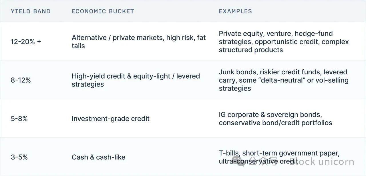 將這些投資組合上鍊並不會改變風險與回報之間的關係。在如今的 DeFi 前端,五種截然不同的風險等級可能都以同一張友好的廣告形式呈現:「存入 USDC,賺取 X% 收益」,卻幾乎不會顯示你承擔的是現金、投資級信貸、垃圾級信貸、股票還是對沖基金的風險。