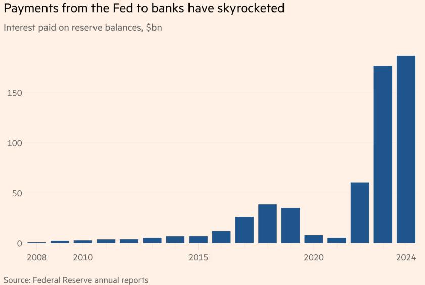 自 2008 年以來,銀行可從存放在美聯儲的現金中獲得利息,這為美聯儲提供了一個影響金融體系短期利率和流動性的機制。然而,過去兩年利息支付額飆升,2024 年作為準備金利息支付的金額高達 1865 億美元。