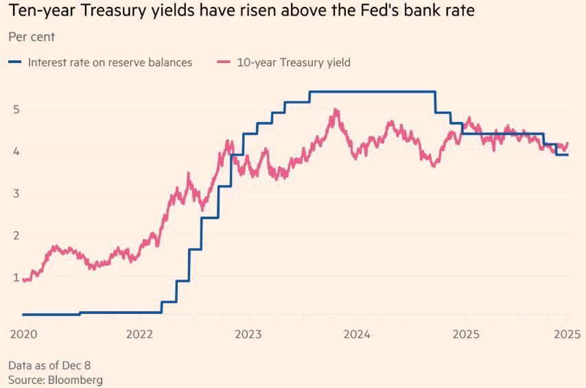 2022 年和 2023 年初,美聯儲將其基準聯邦基金利率目標區間從接近零的水平迅速提升至 5% 以上。該央行隨後於 2024 年末開始下調其目標區間,並已暗示將進一步降息。本月,美聯儲將利率降至三年來的最低水平。