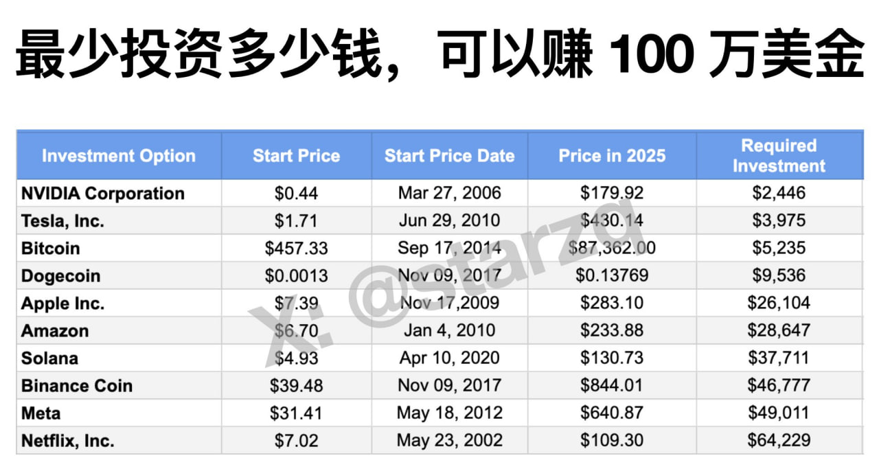 據 @starzq 統計,對於主要的加密資產和核心美股資產,如果想要花費最小投資額賺到 100 萬美元,則需要在 2006 年 3 月 27 日以 $0.44 價格最少買入 2,446 美元的英偉達股票可在 2025 年達成 100 萬美元目標;或在 2010 年 6 月 29 日以 $1.71 價格買入 3,975 美元的特斯拉股票;或在 2014 年 9 月 17 日以 $457.33 價格買入 5,235 美元的 BTC;或在 2017 年 9 月 17 日以 $0.0013 價格買入 9,536 美元的狗狗幣等。