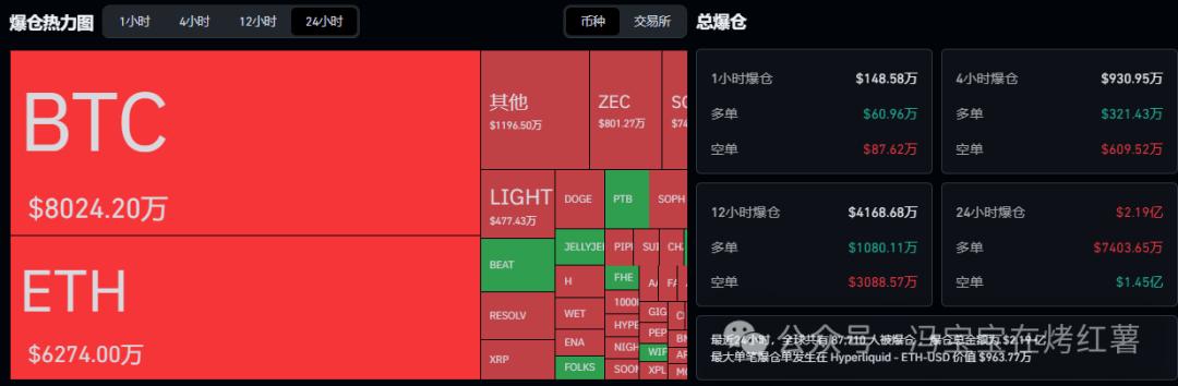 過去24小時全網共有87,710人被被爆倉,爆倉總金額為$2.19億美元,多單爆倉7403.58萬美元,空單爆倉1.45億美元。
