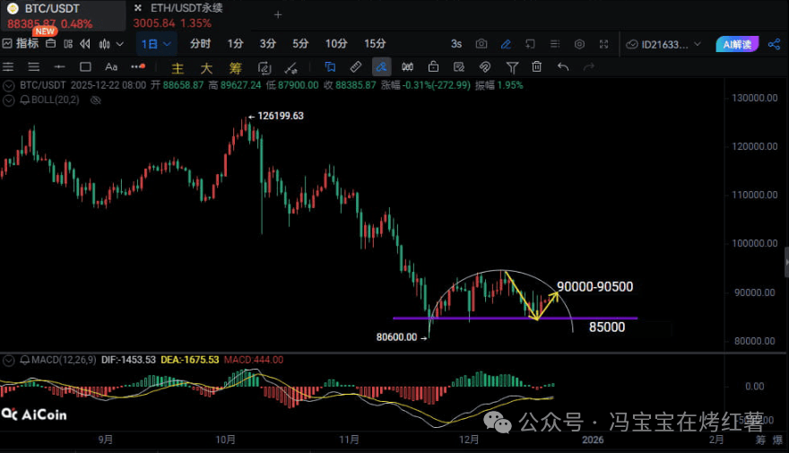 比特幣目前日線形成圓弧頂形態,價格多次在90000-90500附近受阻回落,生命線在85000附近。若能突破90500上方,後市局勢利好。